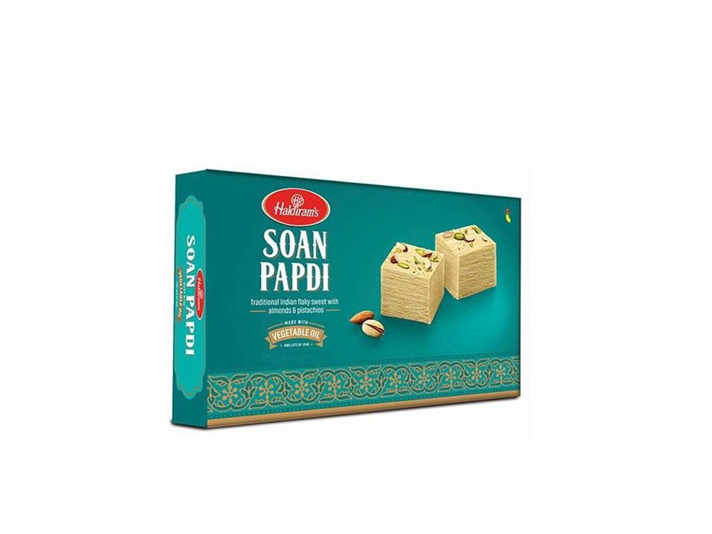 Haldiram‘s Soan Papdi (Soan Halwa) -  lehká a sladká kombinace chutě mandlí, kardamomu a pistácií.  Dezert Soan Papdi má vločkovou konzistence.